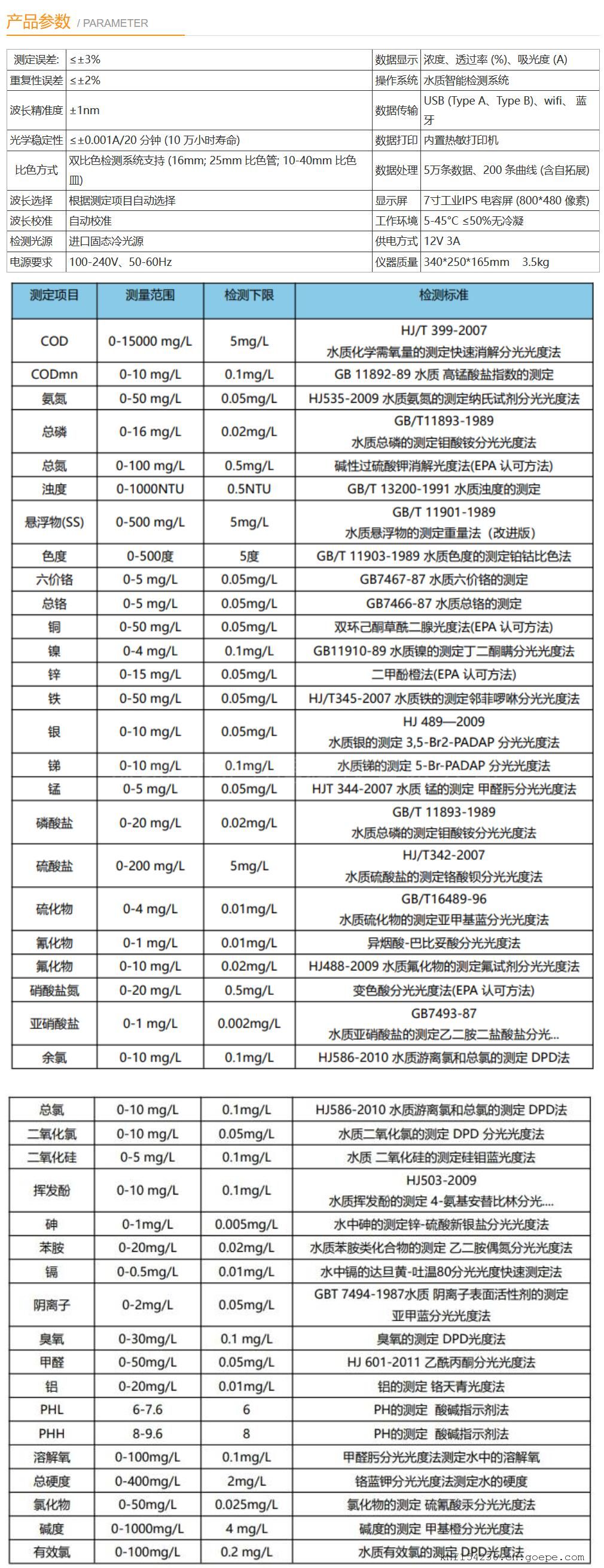 1、支持COD、氨氮、总磷、总氮、浊度、悬浮物……等40多项检测指标。